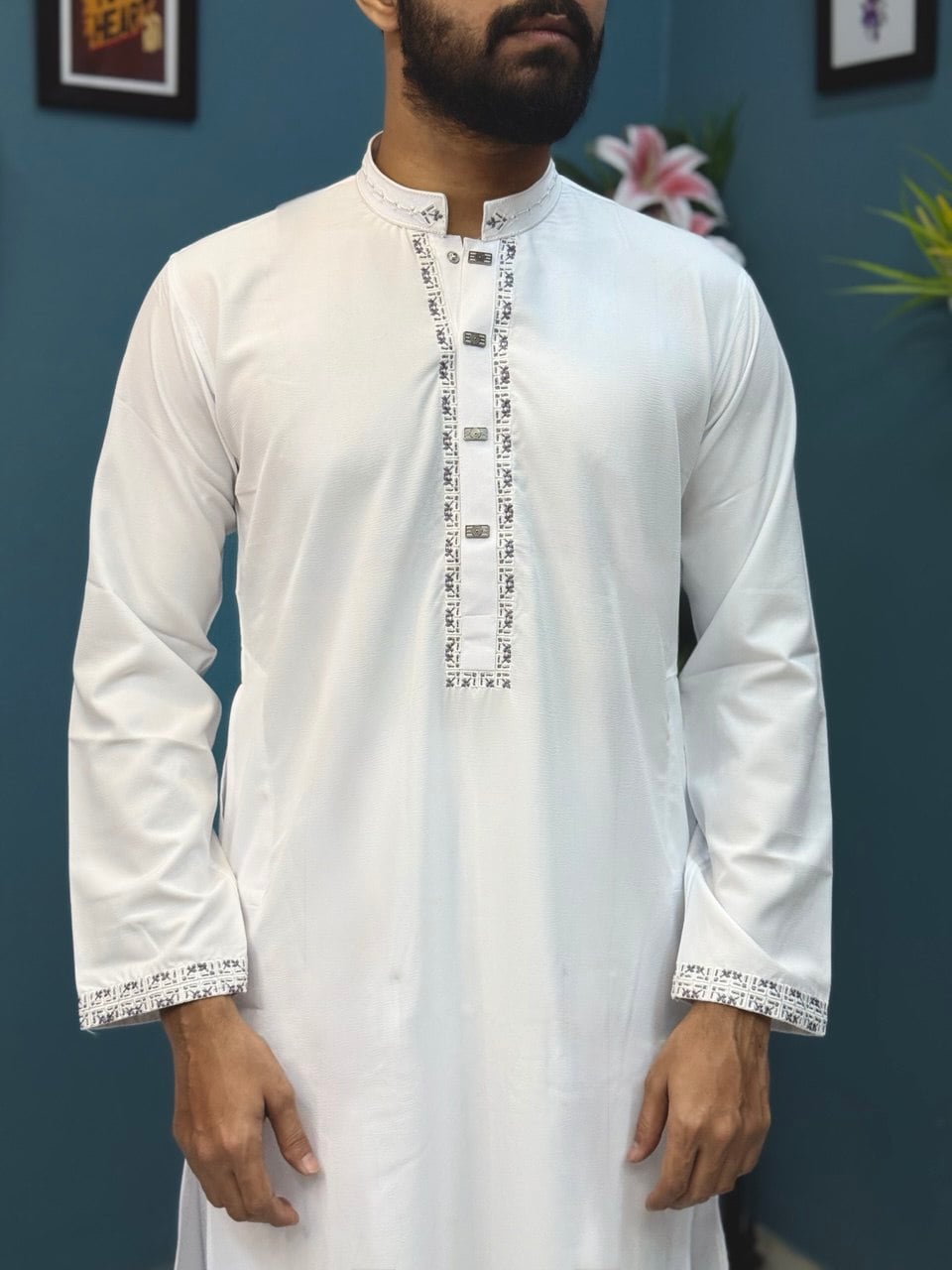 ম্যান্ডারিন কলারের চারপাশে ডেলিকেট এমব্রয়ডারি কাজ, ফ্রন্ট প্ল্যাকেট ও স্লিভ কাফে ম্যাচিং ডিজাইন পুরো পাঞ্জাবিটিকে করেছে সুন্দরভাবে ব্যালেন্সড। প্রিমিয়াম মেটাল বাটন ব্যবহার করা হয়েছে, যা ডিজাইনের সাথে মানানসই হয়ে সামগ্রিক লুককে আরও শার্প ও এক্সক্লুসিভ করে তুলেছে।