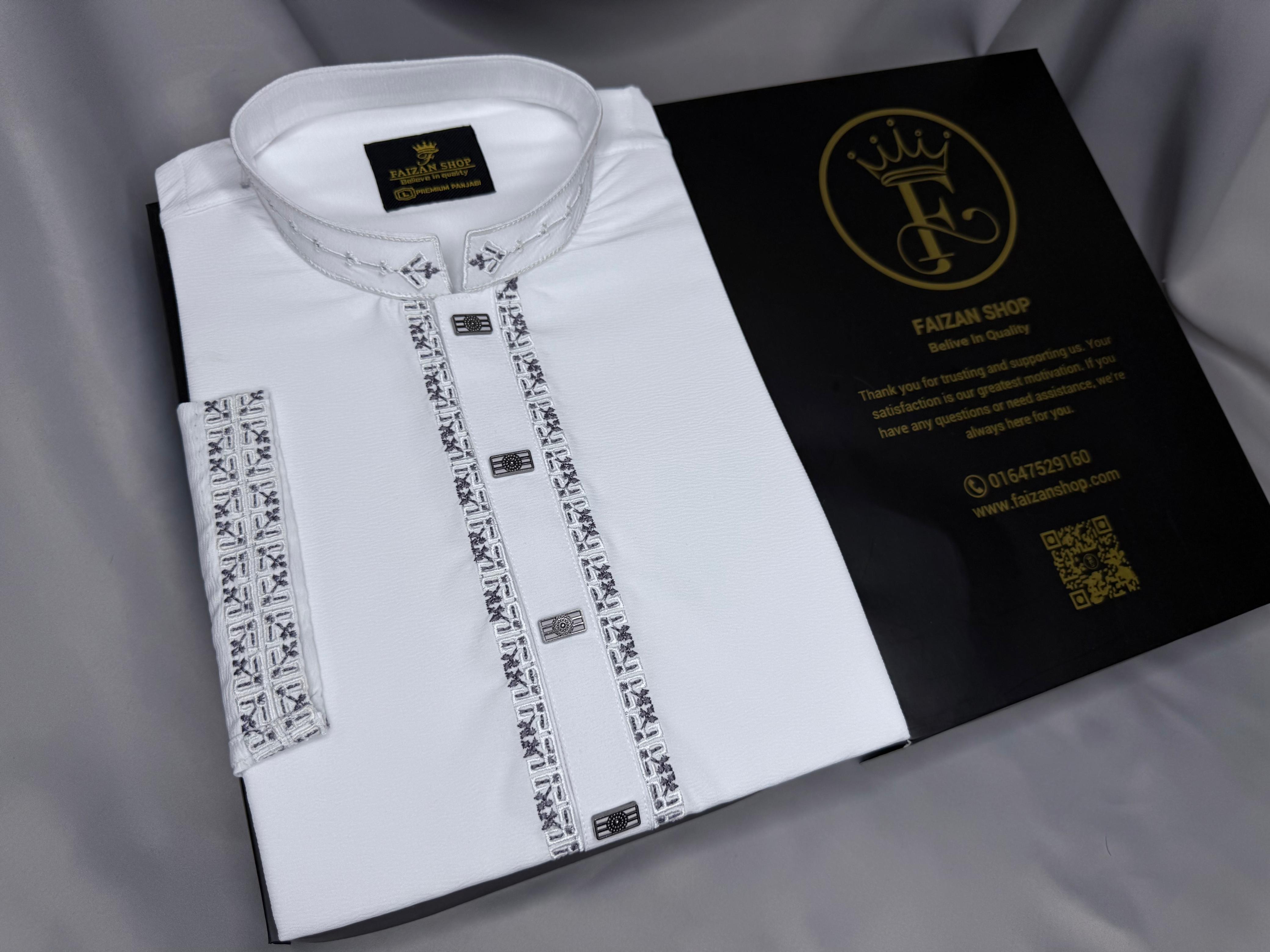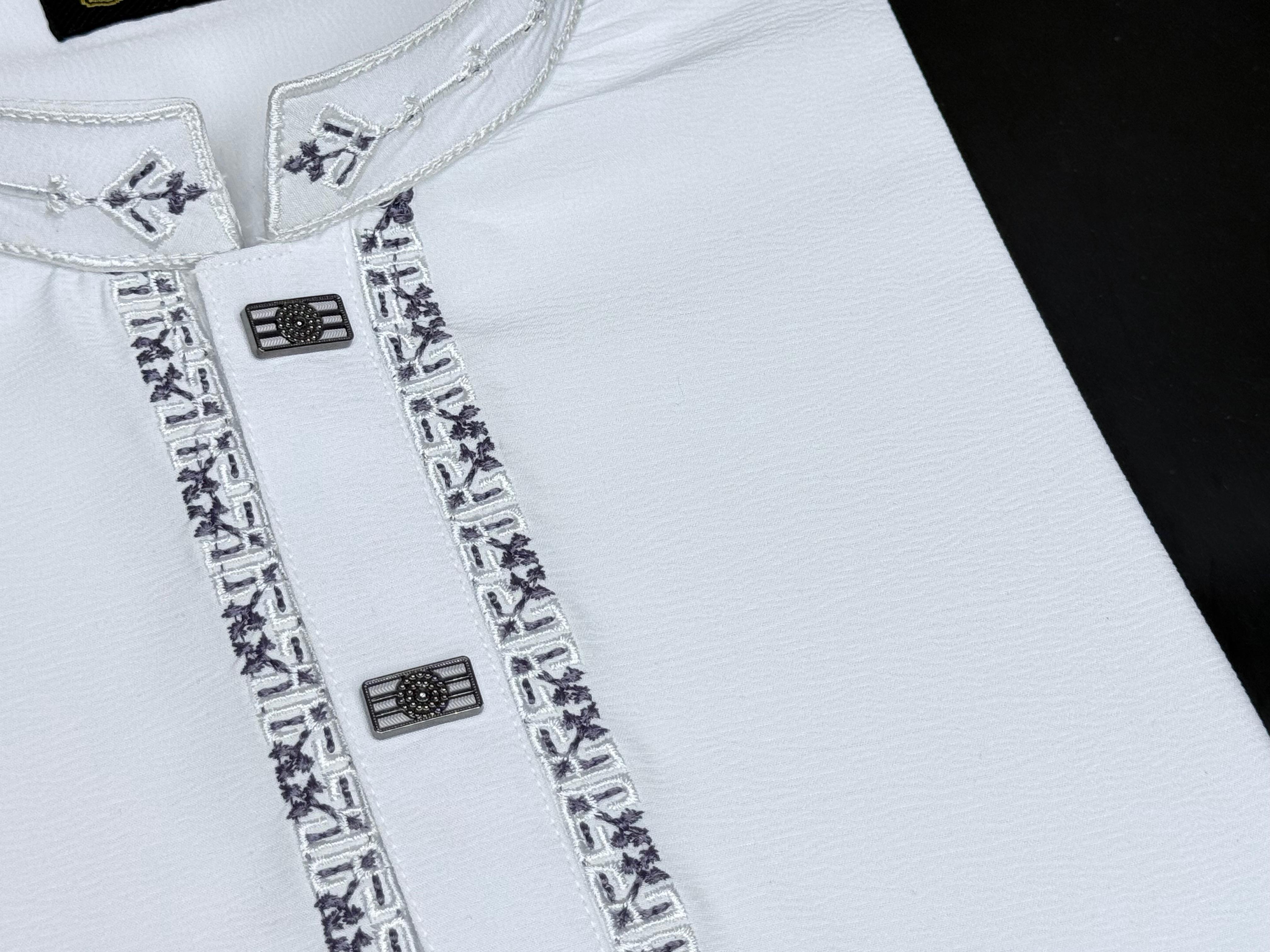 এই প্রিমিয়াম পাঞ্জাবিটি তৈরি করা হয়েছে উন্নতমানের China Zafran Stitch Fabric, যা মসৃণ টেক্সচার ও আরামদায়ক পরিধানের নিশ্চয়তা দেয়। পিওর হোয়াইট কালারের উপর সিলভার-গ্রে টোনের সূক্ষ্ম এমব্রয়ডারি পাঞ্জাবিটিকে দিয়েছে এক নরম, রুচিশীল ও পরিমিত এলিগেন্স।